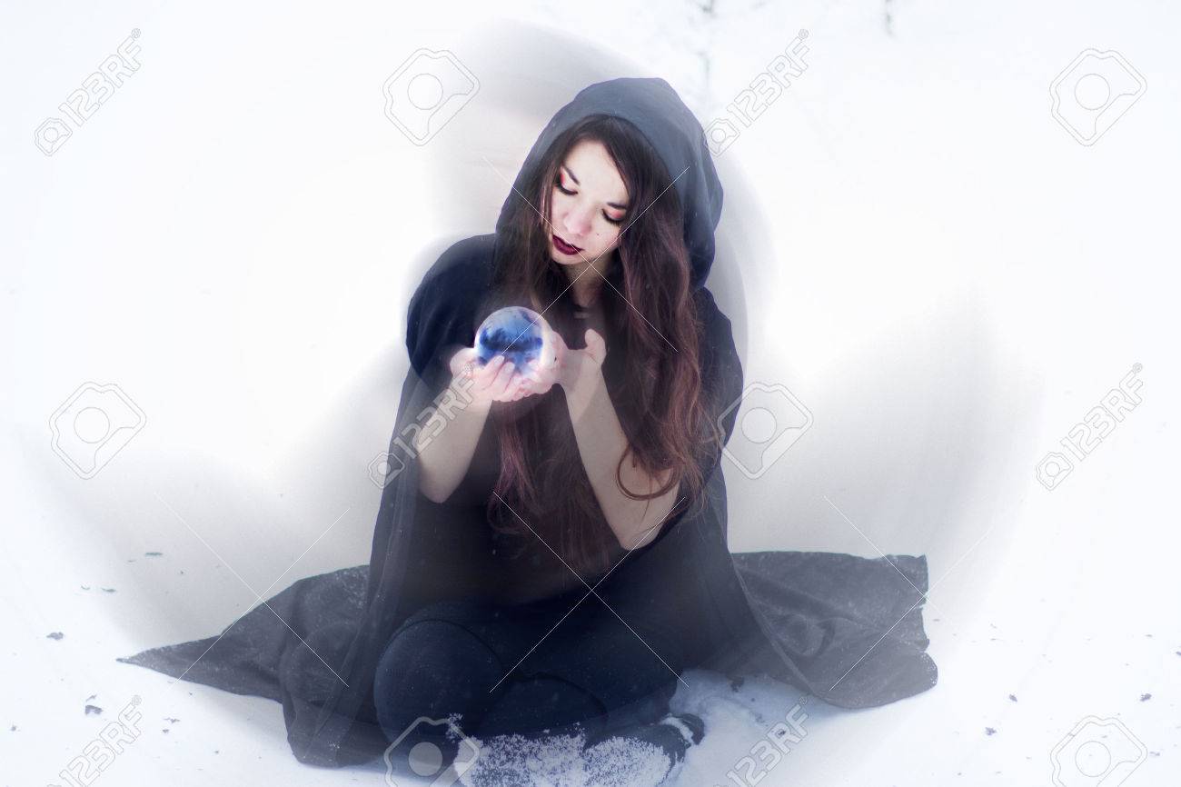 Hexe Oder Eine Frau In Schwarzem Mantel Mit Glaskugel Im Weißen Schnee Wald Lizenzfreie Fotos, Bilder Und Stock Fotografie. Image 24525838.